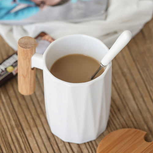 Retro Mat Brun Keramisk Te- og Kaffekop Sæt med Træunderlag – 250 ml, Med Håndtag